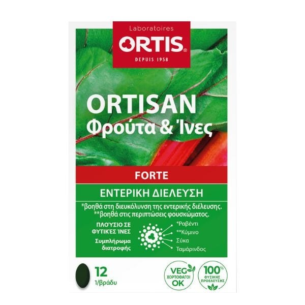 Το Ortis Ortisan Forte Fruits & Fibres είναι ένα συμπλήρωμα διατροφής με υψηλή περιεκτικότητα σε φυτικές ίνες, το οποίο διευκολύνει την εντερική διέλευση και βοηθά σε περιπτώσεις φουσκώματος.